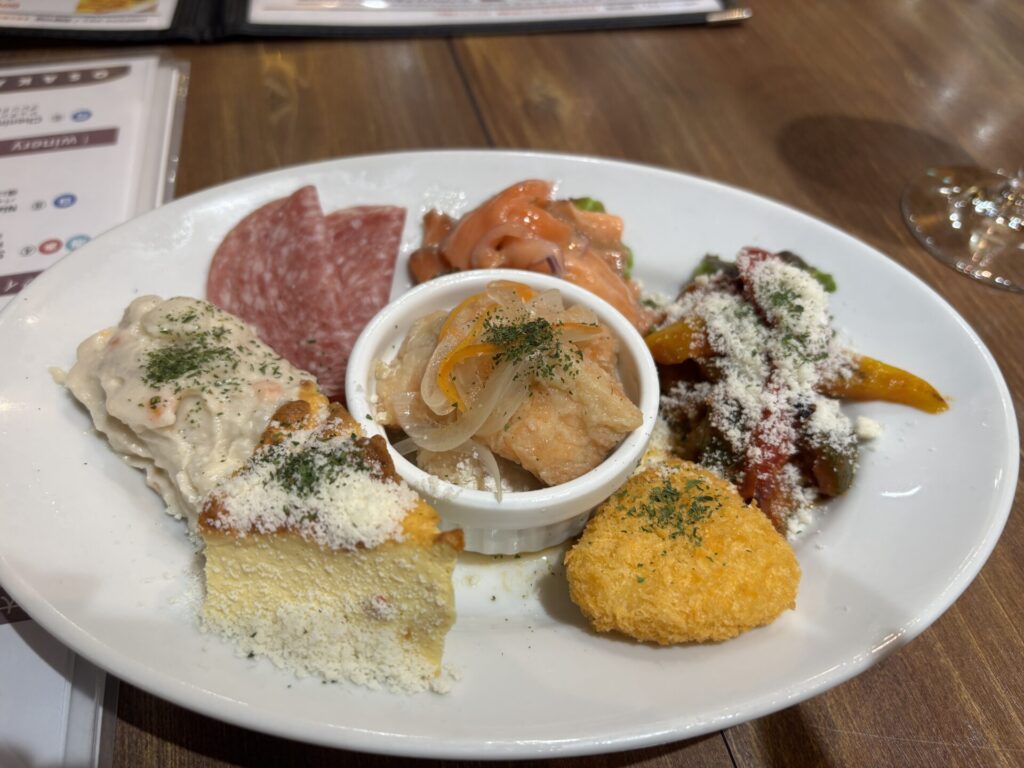 サーモンの南蛮漬けやパプリカのカポナータ?がとてもワインにあって美味しいです。