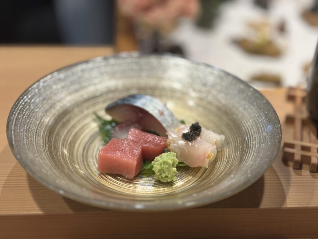 本マグロ、さば、鯛の中にフォアグラが入っておりキャビアが載っています。