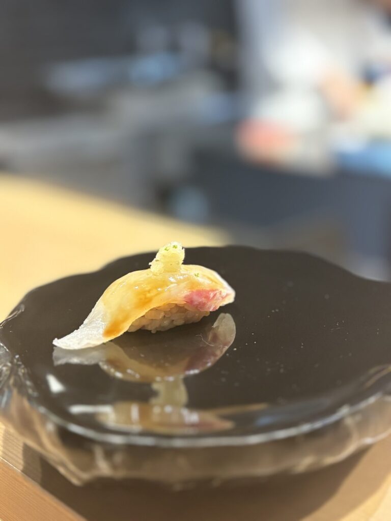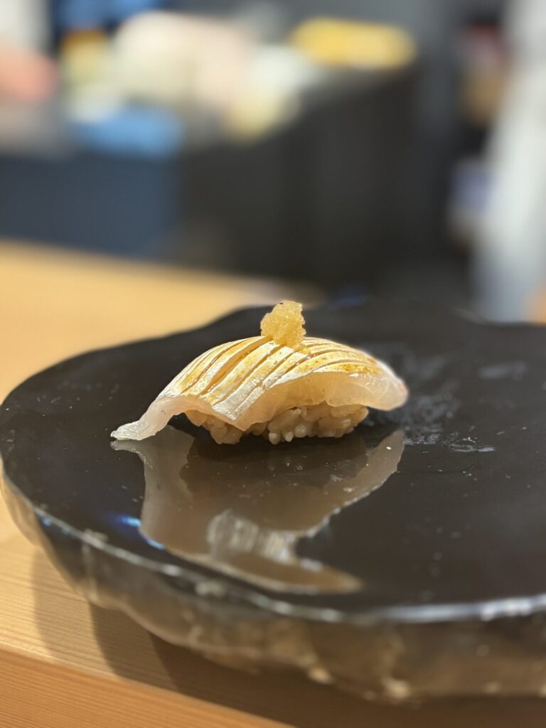 鯛の部分で最も脂がのった部位です。美しく均等に包丁で切れ目が入っていますね。トロける食感です。