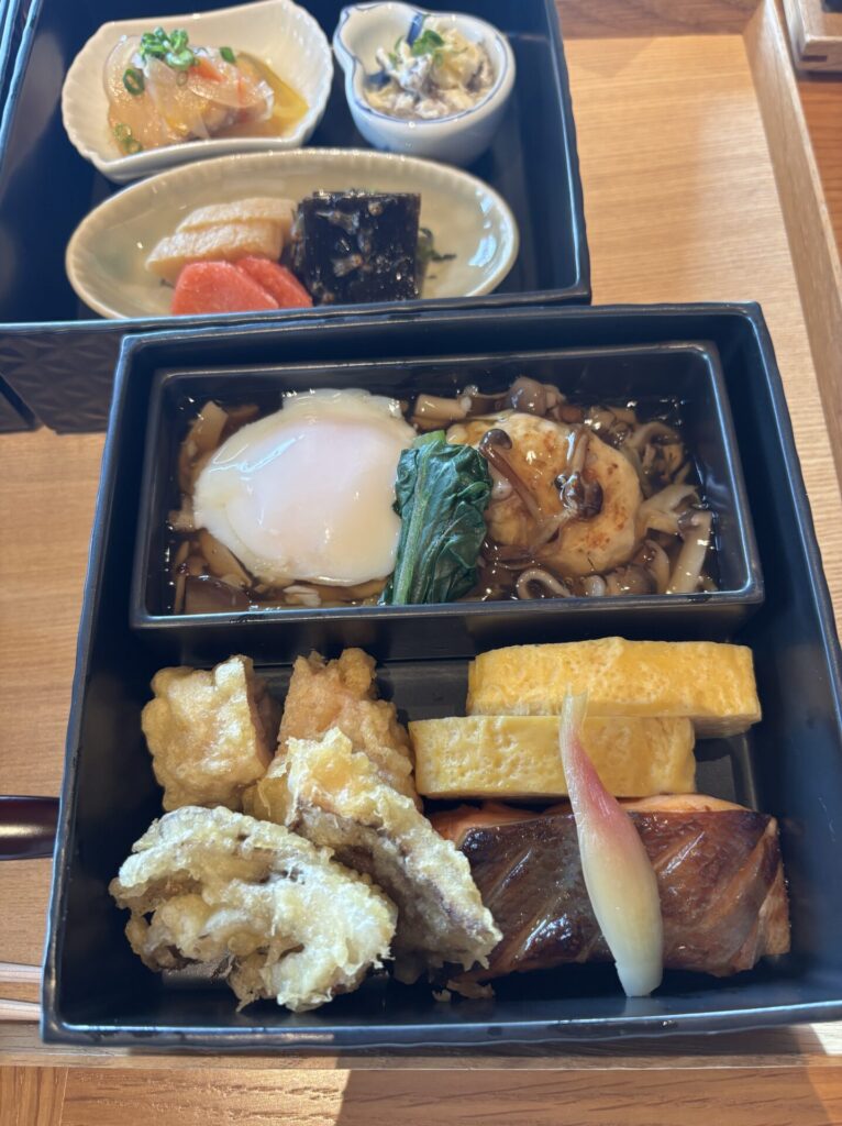 ビュッフェも品揃えが多くて惹かれますが、和朝食は1つのお重にアートのように完成された料理が広がっています。